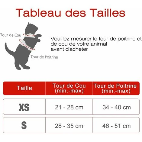 Taille XS: Harnais chat de la taille XS convient pour la tour de cou de 21-28cm et la tour de poitrine de 34-40cm de votre petit. (Veuillez référer au tableau de taille sur la troisième image). Avant de l’acheter, nous vous proposons de mesurer votre chat ou chien, sa tour de cou et de poitrine, c’est plus précieux de mesurer son poids