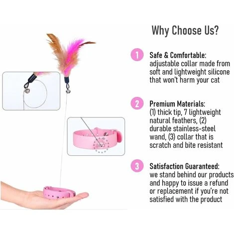 MATÉRIAUX PREMIUM : Ce jouet comporte trois parties : (1) il contient 7 plumes naturelles légères et douces ; (2) la baguette est en acier épaissi et a une bonne élasticité et durabilité; (3) le collier est fabriqué à partir de silicone de qualité alimentaire, qui est doux, léger, a une bonne résilience et résiste aux rayures et aux morsures.