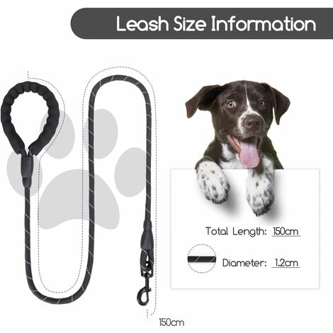 de note. [High Quality Closing Hooks]- Le grand mousqueton métallique est fabriqué en matériau antirouille et anticorrosion, avec un clip pivotant pour éviter la torsion. [Poignée rembourrée confortable]- Nous avons utilisé une poignée rembourrée EVA douce et durable, qui protège vos chiens et votre main de la friction de la corde, vous fait profiter du bon moment de la promenade avec vos chiens. [Suit pour divers types de chiens]- La longueur de 1,5M peut satisfaire votre promenade quotidienne, notre laisse convient à divers types de chiens tels que le Labrador, le Golden Retriever, le Cocker Spaniel, le Pitbull, le Berger allemand, le Husky