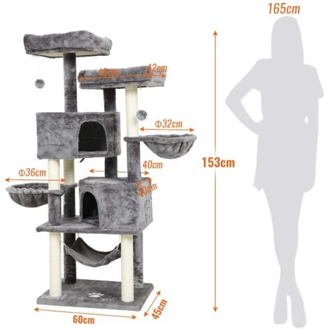 ZONE DE CONFORT POUR VOTRE CHAT Avec 3 grottes : L’excellent équipement de cet arbre à chat 2 plates-formes d’observation, avec 2 grottes et des boules en peluche avec cloches, 2 cages à chat rondes, ce poteau à chat offre suffisamment d’espace pour toute une famille de chats.