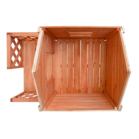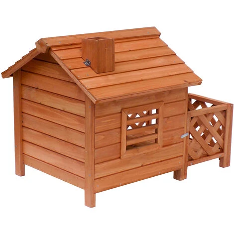 Cette cage pour chats spacieux a les dimensions suivantes 95 cm x 67 cm x 69 cm et est fabriqué à partir d’un bois d’épicéa écologique. Un vrai accroche-regard. Le toit est équipé d’une petite cheminée. Tout près du chenil, se trouve une terrasse avec enclos en tant qu’espace extérieur supplémentaire et éventuellement pour y déposer sa nourriture.