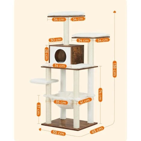 Avec un contraste visuel entre la surface boisée marron rustique et les tissus blancs, cet arbre à chat de 138 cm embellit votre intérieur