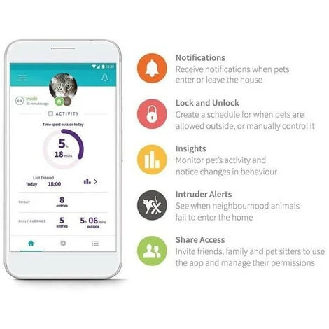 Chatiere connect a puce électronique – Avec l’Hub et l’appli Sure Petcare, possibilité de définir les heures d’ouverture et de fermeture, d’autoriser certain chats a sortir en gardant les autres a l’intérieur et en prendre le contrôle a distance – Permet surveiller leurs activités sur de longues périodes.