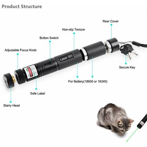 Stylo laser vert de chasse super brillant – Retirez le capuchon, vous pouvez voir le rail laser même en milieu de journée, il peut même allumer une allumette. La sortie laser est bien supérieure à 5 mw. Vous pouvez l’utiliser pour indiquer les constellations et où différents modèles Tactical Scope Sight Laser Pen – Vous pouvez voir différents modèles lorsque vous faites pivoter le capuchon, cela peut vous apporter, à vous ou à votre animal de compagnie, un jeu intéressant. En utilisant ce stylo à lumière laser pour chat, vous pouvez simplement vous asseoir sur le canapé et interagir avec votre chat ou votre pointeur laser vert Safe Child Lock – Faites pivoter l’interrupteur vers le point rouge ou vert pour éteindre ou allumer le pointeur laser à tout moment ou n’importe où. Lorsque vous ne portez pas le stylo laser, vous ne craignez pas d’être pris par votre enfant. Batterie rechargeable USB – Les lasers portables de haute qualité peuvent toujours être avec vous pour travailler ou jouer. Vous pouvez utiliser une batterie au lithium rechargeable 18650 ou 16340 dans notre stylo de portée de fusil de chasse laser. Ensemble de pointeur laser vert – 1 x stylo laser vert haute puissance + 1 x capuchon multi-motifs amovible + 1 x batterie 18650 + 1 x chargeur + 2 x clés.