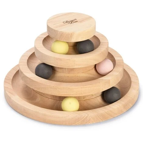 Le bois d’hévéa présenté est marron avec de belles nuances naturelles, ce qui le rend adapté à tous les intérieurs. Cette tour pour chats est conçue avec trois niveaux et des balles jouets incluses. Dès que votre chat touche les balles jouets avec son museau ou sa patte, les balles commencent à rouler dans toute la tour de jeu.