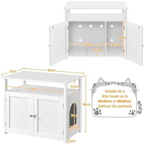 - Bac à litière compatible : L’espace intérieur se divise en deux parties : une partie de 23,2 cm de large ou une autre de 47,4 cm de large. Vous pouvez y placer un grand bac à litière ou deux petits bacs à litière en retirant le séparateur.